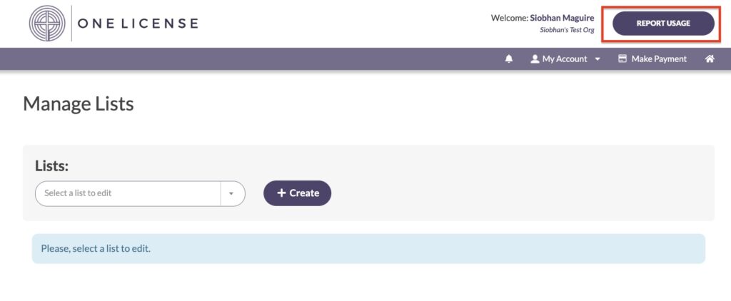 Once you have created your lists and added songs to those lists, you can easily access them to complete your reporting. To do this, again click on My Account > Manage Lists. On the left-hand side of the screen, you will see a drop-down menu that contains your lists.