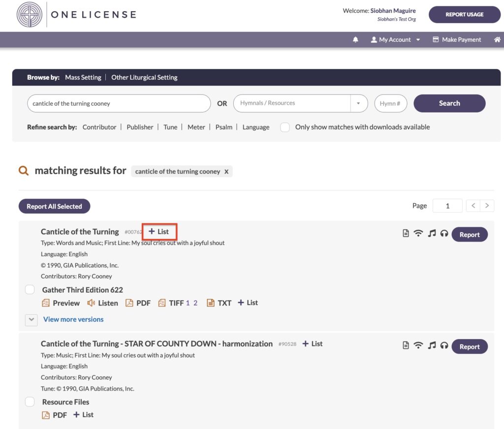 When you have found the correct entry, click on the “+ List” button to the right of the song title.