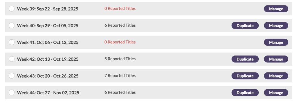 This change may have shifted some of your past reports into different weeks, or it may have left your report with an empty week. Rest assured that your reporting history is still intact and there is no need for you to adjust any of your past reports. All of your reported titles have been noted correctly, and the corresponding composers, authors, and publishers will receive the appropriate royalties from those reports. If this has shifted your reports to leave you with a week where you have no titles to report, you can note that with the following steps: