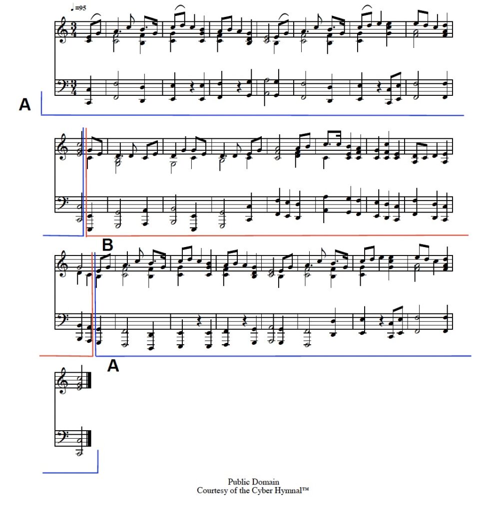 The ternary form (ABA) of the melody works to establish familiarity, then moves on to something new before recapping the familiar section. As the 24 measures of THAXTED unfold, you’ll notice that the first and last 8 measures sound identical, while the middle 8 measures add contrast. Many of our favorite hymn tunes use a similar form, and this helps congregations know what to expect during group singing, even if they don’t read music.
