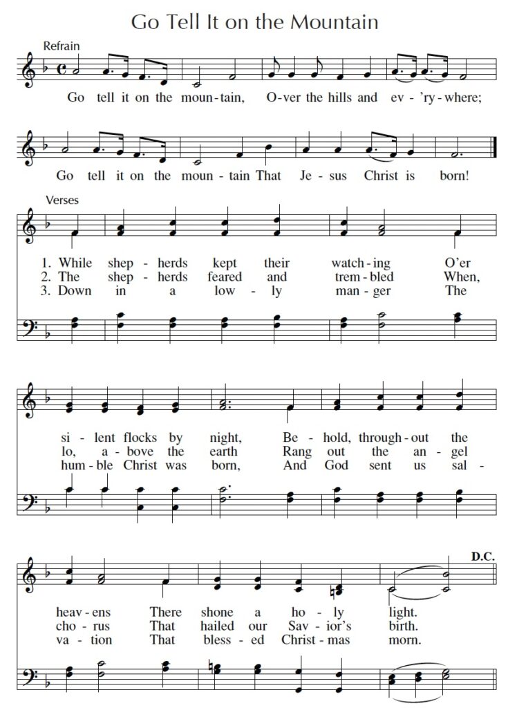 GO, TELL IT ON THE MOUNTAIN likely began life as one of the spirituals sung by enslaved Foundational Black Americans. Its composer(s) remain anonymous, and probably will forever, because of history long suppressed and erased. In the intervening centuries, though, “Go, Tell It on the Mountain” has become a standard proclamation of the triumph of the Lord’s incarnation, enjoyed by Christians of all cultures.